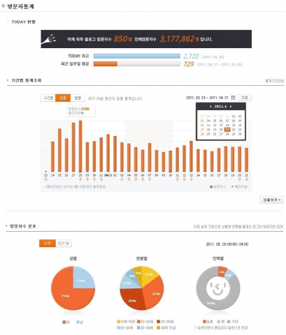 방문자 통계 중 ‘방문자 수 분포’란을 통해, 내 블로그에 방문한 이들에 대한 성별, 연령별, 인맥별 방문 비율 확인도 가능해졌다. 내 블로그에 방문하는 일촌과 팬의 비율이 한 눈에 표시돼 블로그에 대한 내부/ 외부 인맥의 유입 비율에 대한 분석 시 유용하다.