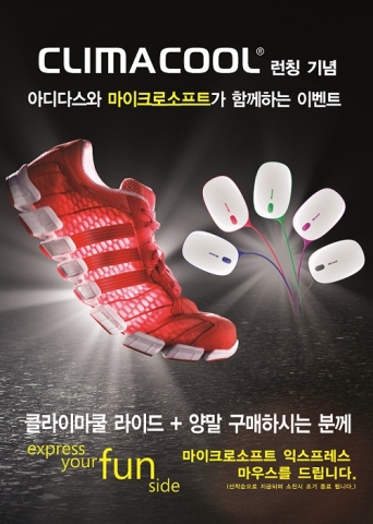 이번 공동 프로모션은 양사의 신제품이 사용자의 취향과 개성을 반영할 수 있는 다채로운 컬러와 감각적인 디자인, 그리고 뛰어난 기능성이라는 공통점을 지닌 데서 출발했다. 지난 11일 출시된 한국마이크로소프트의 익스프레스 마우스는 레드, 핑크, 보라, 하늘색 등 올해에 유행할 패션 트렌드 컬러를 적용해, 밝고 경쾌한 느낌의 다채로운 15종의 컬러로 제작된 아디다스의 클라이마쿨 라이드 제품과 잘 어울리는 것은 물론, 매장 디스플레이에서부터 시너지 효과를 창출할 것으로 예상된다.