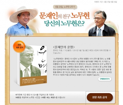 한편 알라딘은 노무현과 참여정부의 이야기를 담아 기대를 모으고 있는 문재인 전 비서실장의 신작 <문재인의 운명>을 함께 조명하며 해당 도서의 서문을 최초로 단독 공개했다.