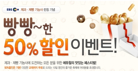에듀윌은 EBS제과제빵기능사 런칭을 기념해 ‘빵빵한 50% 할인 이벤트’를 6월 7일부터 16일까지 진행한다. 이벤트 기간 동안 강의를 수강 신청하면 EBS교재와 기출문제집 그리고 PMP 및 MP3 강의가 무료 제공되는 푸짐한 혜택을 모두 받을 수 있다. 제과제빵기능사 취득을 위한 동영상 강좌는 평소 제과제빵기능사 자격증에 관심은 갖고 있었지만 관련 학원의 수강이 필수적이라고 생각해 준비를 망설였던 예비 수험생들에게 자격증 취득의 문턱을 낮춰 시험준비에 대한 부담을 크게 해소할 것으로 기대된다.