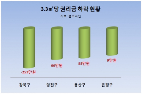 분석 결과에 따르면 권리금이 가장 많이 내린 곳은 강북구였다. 이 지역 권리금은 3.3㎡당 474만8872원에서 221만1682원으로 반 토막 났다. 하락률은 53.43%(253만7190원).