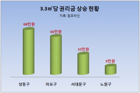성동구 다음으로 권리금이 많이 오른 곳은 마포구였다. 마포구 권리금은 321만6393원에서 387만7175원으로 66만782원(20.54%) 올랐다. 이어 노원구 권리금이 354만9853원에서 364만5555원으로 9만5702원(2.70%) 늘었다.
