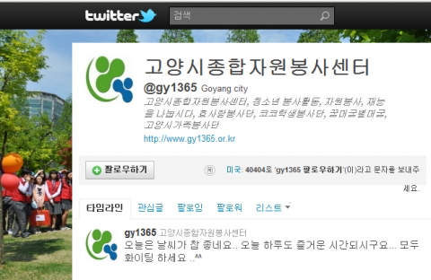 이에 고양시종합자원봉사센터에서는 자원봉사 사행시 짓기, RT(Retweet)이벤트를 진행해 20여명에게 다이어리와 천연비누를 증정했다. 작년 11월, 김장담그기활동, 서명운동 등이 블로그와 트위터를 통해 모집 홍보 되었고 올해 10월 있을 전국체전자원봉사모집 홍보 역시 트위터와 블로그를 이용하고 있다.