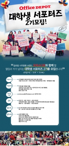 오피스디포 대학생 서포터즈 2기는 사무용품과 유통 분야에 관심이 많은 수도권 소재 대학교 1~3학년 재학생이라면 누구나 지원 가능하며, 오피스디포 서포터즈가 되고 싶은 이유 및 대외 활동 경험 위주로 작성한 자유 양식의 이력서를 담당자 이메일(juhee.jung@officedepot.co.kr)로 제출하면 된다.