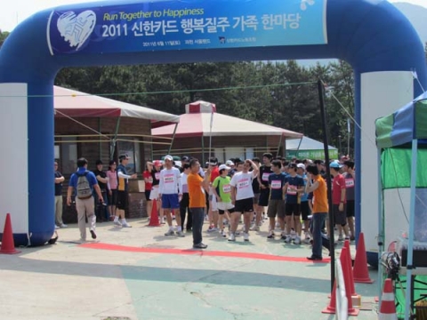 한편, 다른 한 켠에서는 마라톤 대회를 위한 준비가 한창이었다. 참가자들은 번호표를 가슴에 붙인 뒤 함께 몸을 풀기도 하고 서로 파이팅을 외치기도 하였다. 잠시 후, 황원섭 신한카드 노동조합 위원장의 인사말과 함께 임직원들이 터치 버튼을 이용해 출발을 알리는 퍼포먼스를 진행하였고 마라톤 대회 참가자들은 일제히 힘차게 달려나갔다.