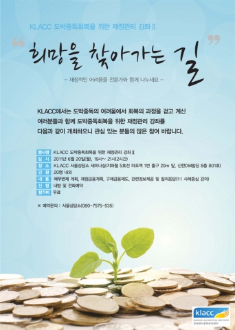 도박으로 인해 탕진한 경제적 손실은 실직, 가정파탄, 법률적인 문제 등으로 이어진다. 이에 KLACC은 도박중독 회복에 있어서의 심리적인 치유와 상담뿐만 아니라 이들이 회복하는데 도움이 될 수 있도록 올바른 부채상환, 신용관리 및 재정관리 등의 주제로 특강을 실시하여 이들이 희망을 찾아가는 길에 함께하고자 한다.