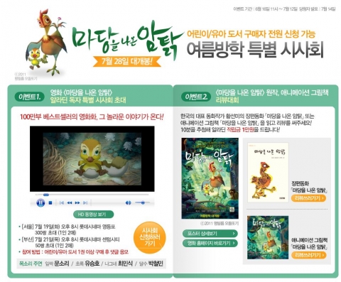 <마당을 나온 암탉> 시사회는 서울 지역 7월 19일, 부산 지역 7월 21일에 진행되며, 이벤트 기간은 7월 12일까지이다.