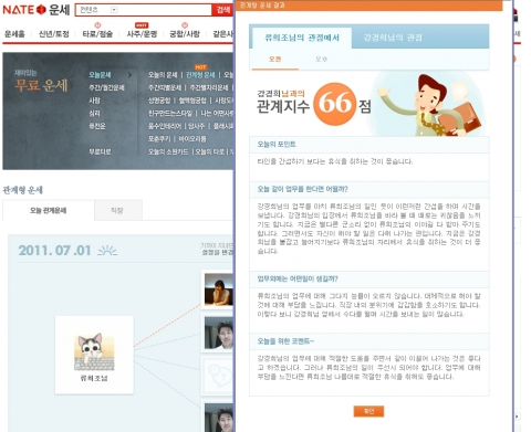 이용방법도 간편하다. 네이트 운세 메인 페이지에서 관계형 운세 배너 선택 후 관계 설정하기를 클릭해 자신의 네이트온 친구나 싸이월드 일촌 중 관계지수를 알고 싶은 사람을 선택하면 바로 운세를 받아 볼 수 있다. 최대 50명까지 동시 등록이 가능하다.