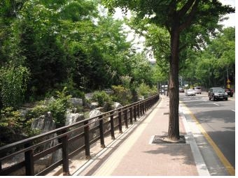 보도폭이 1m 내외로 좁아 보행자들에게 불편을 초래한 구간은 보도폭을 2.5~3.0m로 확장하고 데크 및 띠녹지를 설치하여 쾌적한 보행여건을 조성하였다.
