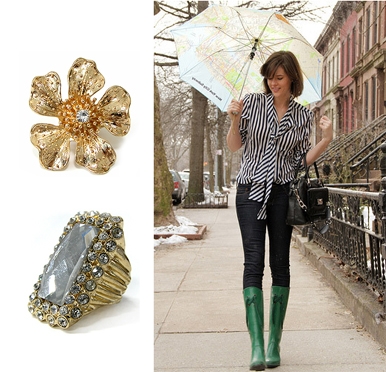 알록달록 레인부츠- 장마철 누구나 한 켤레쯤은 장만한 레인부츠. 레인 부츠는 대부분 단색의 색상이기 단색의 컬러에는 골드 컬러의 주얼리를 같이 매치 하게 되면, 디자인에 따라 다양한 스타일을 연출 가능하다.