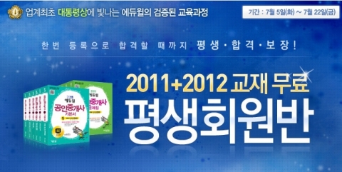 에듀윌은 이러한 시험경향을 반영해 2012년 교재까지 보장함으로써 재시험에 필요한 수험료 걱정을 100% 해소했다. 정규학원 강좌와 스튜디오 강좌를 모두 제공해 2배의 학습효과를 기대할 수 있도록 했으며, 2012년 8월 말까지 공인중개사 학원 수강을 무료로 제공함으로써 온오프라인 통합교육을 받을 수 있다는 점도 특징이다. 이와 같은 파격혜택은 7월 5일부터 22일까지 한정적으로 실시될 예정이다.