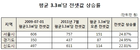 부동산뱅크(www.neonet.co.kr) 조사에 따르면 서울의 경우 2년 전에 비해 전셋값이 24.87%(3.3㎡당 606만→757만 원) 올라 평균 3.3㎡당 151만 원 전세금을 올려줘야 하는 것으로 나타났다. 예들 들어 신혼부부들이 많이 찾는 중소형 아파트 중 공급 75㎡(구 23평형) 아파트의 경우 3,473만 원을 올려줘야 한다.