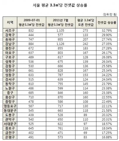 특히 구로구 온수동은 평균 전셋값이 86.83%(3.3㎡당 294만→489만 원)나 올라 서울에서 가장 높은 상승률을 보였다. 이밖에 서대문구 냉천동이 78.90%(3.3㎡당 479만→858만 원), 은평구 역촌동 60.18%(3.3㎡당 367만→587만 원), 용산구 효창동 58.85%(3.3㎡당 542만→860만 원), 강동구 강일동 53.54%(3.3㎡당 455만→698만 원), 구로구 고척동 47.07%(3.3㎡당 398만→585만 원), 송파구 송파동 47.53%(3.3㎡당 549만→810만 원), 서초구 반포동 45.53%(3.3㎡당 916만→1,332만 원), 동대문구 용두동 45.29% (3.3㎡당 579만→842만 원), 동작구 사당3동 43.34%(3.3㎡당 453만→649만 원), 마포구 서교동 42.86%(3.3㎡당 621만→887만 원) 등은 전세금을 2년 전에 비해 평균 40% 이상 올려줘야 하는 것으로 조사됐다.