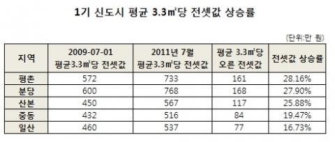 이밖에 1기 신도시 전셋값은 지난 2년 동안 22.81%(3.3㎡당 497만→611만 원)로 평균 3.3㎡당 114만 원이 올랐다. 평촌 28.16%(3.3㎡당 572만→733만 원), 분당 27.90%(3.3㎡당 600만→768만 원), 산본 25.88%(3.3㎡당 450만→567만 원), 중동 19.47%(3.3㎡당 432만→516만 원), 일산 16.73%(3.3㎡당 460만→537만 원) 등의 순으로 전셋값이 상승했다.