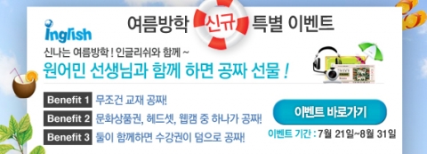 인글리쉬 신규특별이벤트는 여름방학을 맞아 단기집중 온라인 화상영어를 고려하고 있는 학습자에게 합리적인 가격에 효과적인 영어학습 프로그램을 제공하기 위하여 마련되었다. 신규회원을 대상으로 진행되는 본 이벤트는 7월 21일부터 8월 31일까지 진행되며 학습자의 연령과 수준에 따라 마련된 인글리쉬 주니어와 인글리쉬 시니어 모두 해당된다.