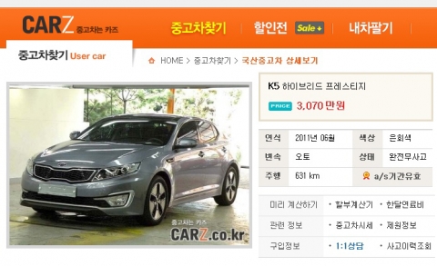 지난 25일 중고차 전문업체 카즈에 등록된 ‘K5 하이브리드’ 중고차는 6월 출고, 631km 주행에 그친 임시번호판급 차량이다. 신차로는 하이브리드 세제혜택 적용 후 3,095만원에 판매되는 ‘프레스티지’ 등급이며, 112만원 상당의 썬루프 사양을 추가한 중고차 1호의 가격은 3,070만원. 신차구입비용에서 약 5% 감가되어 137만원 저렴해졌다. 일반적인 신차급중고차의 감가수준과 비슷하지만 K5 중고차의 첫 등장과는 차이가 있다.