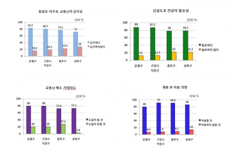 이와 함께 이 지역의 심각한 교통난을 해결하기 위해서는 서울 서북부 외곽지역과 도심을 잇는 신설 도로가 필요하다는 응답이 83.0%로 나타났다.