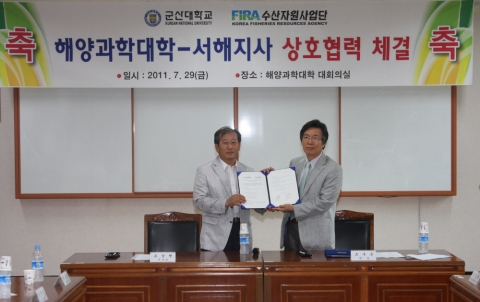 협약식에는 조수근 학장을 비롯해 해양생명학과, 해양생물공학과, 해양학과, 수산생명의학과 등 해당학과 학과장 및 수산자원사업단의 조강현 지사장, 관련부서 팀장, 연구위원들이 참석했다.