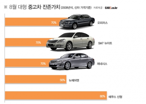 하지만 대형차 사정은 달랐다. 한달 사이 최고 170만원까지 가격이 떨어졌는데, 2009년식 SM7 뉴아트 LE의 8월평균 거래가격은 2,100만원으로 7월 2,270만원보다 5% 감가되었다. 통상적인 중고차 잔존가치가 1개월 1%씩 줄어드는 것에 비하면 놀라운 감가속도라고 할 수 있다. 신형 에쿠스 역시 지난 달보다 140만원 저렴해진 5,300만원에 거래되면서, 한때 경차를 넘어서며 고공행진 하던 잔존가치가 80%대 자락에 겨우 걸쳐진 상태다.