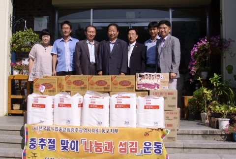 시 지회 및 광산구지부에서는 광산구 신촌동소재 “성심의집”을, 동구지부에서는 동구 용산동 소재 “영신원”을, 서구지부에서는 서구 광천동 소재 “세실리아 요양원”을, 남구지부에서는 남구 송하동 소재 아동복지시설 “신애원”을 방문하여 생필품을 전달하고 봉사활동을 전개 하였으며, 북구지부에서는 북구 유동소재 “수원회관” 일반음식점에서 독거노인 60여명을 초청하여 식사대접 및 생필품을 전달하는 등 소외된 이웃에게 따뜻한 정을 베푸는 “나눔과 섬김” 운동을 실천하였다.