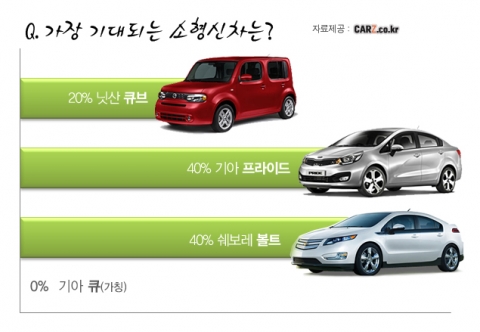 처음 선보이는 국산 박스카 ‘큐’에서부터 국민소형차 ‘프라이드’까지, 과연 이들 중 소비자들이 가장 기대하는 신차는 무엇일까? 중고차 전문업체 카즈가 ‘가장 기대되는 소형신차’를 설문 조사한 결과, 기아의 야심작 ‘프라이드’와 국내출시는 아직 미정인 쉐보레 ‘볼트’가 공동 1위를 차지했다.