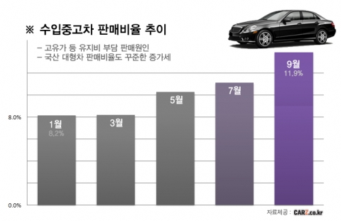 중고차 전문업체 카즈의 통계에 따르면 수입차 판매를 희망한 운전자가 전체 ‘내차팔기’ 문의의 11.9%를 차지한 것으로 나타났다. 올 초 고유가와 함께 상승세를 보이던 수입차 판매문의가 9월에는 열대 중 한 대 꼴이 된 것이다. 이는 올 여름 11.1%를 넘은 것으로 최근 3년 사이 최고치다.