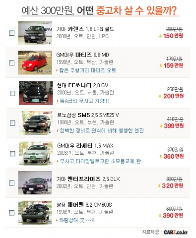 경기를 체감하듯 중고차 시장에서는 가급적 값싸고 기름 적게 먹는 중고차를 찾는 이가 많다. 3백만원을 넘기지 않는 예산으로 어떤 중고차를 구입할 수 있을까? 중고차 전문업체 카즈가 ‘전차종 399만원 이하 할인전’을 참고하여 최대 300만원내에서 선택할 수 있는 중고차를 소개한다.
