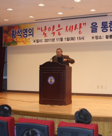 300여명의 교직원 및 학생들이 참가한 가운데 열린 특강에서 작가 황석영은 장편 “낯익은 세상”을 집필하게 된 배경을 “근대화 과정 중 우리가 잃어버린 것, 우리가 상처 받은 것, 우리가 저지른 잘못”에 대한 성찰을 통해 우리 사회가 묻어 두었던 스탑갭(stopgap)을 열고 싶었다고 설명했다.
