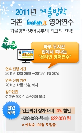 초등학교 1학년부터 중학교 2학년까지 신청이 가능한 인글리쉬 온라인 영어연수는 오는 12월 26일부터 이듬해 1월 26일까지 총 4주간에 걸쳐 진행된다. 본격적인 수업에 앞서 진행되는 레벨테스트를 통해 자녀의 학습수준에 따라 초기 학습 난이도를 차등 적용하여 1:1 원어민 학습효과를 극대화 하였다. 또한 오전 9시부터 오후 9시까지 학습시간 내에서 원하는 시간을 선택하여 수강신청을 할 수 있어 학습자의 편의는 물론 효과적인 시간 안배를 통한 자기주도학습이 가능하도록 하였다.