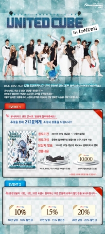 이벤트 참여 방법은 슈마커 홈페이지 가입회원이면 누구나 참여 가능하며, 홈페이지 이벤트 게시판에 ‘유나이티드 큐브 인 런던’을 응원하는 댓글을 남기면 된다. 추첨을 통해 212분에게 슈마커 할인권 및 비스트, 포미닛, 지나가 싸인한 바비번스를 제공한다.