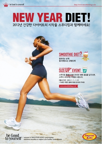 한편, 스무디킹은 1월 한달 동안 ‘New Year Diet’ 이벤트를 진행한다. 2012년을 맞아 스무디킹 고객들의 새해 목표를 응원하기 위해 기획된 것으로 이달 말까지 스무디킹 홈페이지(www.smoothieking.co.kr)와 모바일 페이지(http://m.smoothieking.co.kr)에 자신의 새해 목표를 간단하게 올리면 된다. 스무디킹은 참가자 전원에게 스무디 사이즈업 쿠폰을 증정할 예정이다. 쿠폰은 모든 스무디 제품 및 사이즈에 적용되며, 2월10일까지 사용 가능하다.