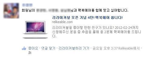 ‘리라이커블(www.relikeable.com)’이라는 서비스는 사용자가 기업이 제공하는 광고 상품을 페이스북 친구들에게 추천하고, 추첨을 통해 친구가 당첨되면 추천한 친구도 같은 선물을 받는 서비스이다.