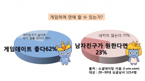 신개념 소개팅 서비스 이음(www.i-um.com)은 지난 2월 20일부터 2월 29일까지 20~30대 성인 미혼남녀 1214명을 대상으로 ‘게임과 연애’에 대한 설문조사를 실시했다. “게임하며 연애할 수 있는가?”라는 질문에 전체 설문참여자 중 남성의 62%는 “가끔은 기분전환용으로 게임하며 데이트하고 싶다.”를 선택하여 게임과 연애를 둘 다 택하는 것에 가장 큰 호감을 보였다. 여성의 23% 또한 “자주가 아니라 가끔이라면 기분전환용으로 좋을 것 같다.”를 선택하며 연인과의 게임데이트에 긍정적인 반응을 보였다.