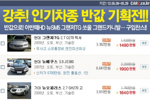 중고차 전문업체 카즈에서 실시하는 ‘인기차종 반값 기획전’에서는 경차부터 수입차에 이르는 인기 중고차들을 신차가격의 반값에 구입 가능하다. ‘아반떼’, ‘SM5’, ‘그랜저’, 그리고 ‘BMW’, ‘벤츠’까지 다양한 차량들을 한눈에 볼 수 있어 더욱 좋은 기회다.