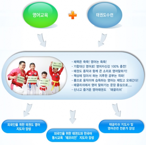 약 10년 전부터 시작된 태권도와 영어회화 교육 융합시대를 연 ‘태글리쉬’는 태권도로 배우는 한국어 ‘태코리언'(Taekwondo+Korean), 영어놀이 체육 ’짐글리쉬(Gym+English) 등의 융합 교육방법을 태글리쉬 지도사 연수를 통해 교육하고 있다.
