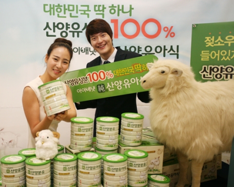28일 오전 서울 롯데마트 서울역점에서 아이배냇 산양분유의 롯데마트 입점을 축하하며 남녀모델들이 엉덩이에 얼룩무늬가 그려진 흰 산양 모형 앞에서 대한민국 딱 하나 산양유 100% 아이배냇 산양분유를 손에 들고 포즈를 취하고 있다.