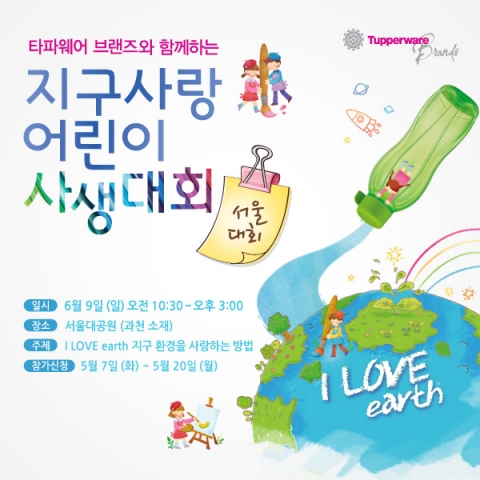 ‘제3회 타파웨어 I LOVE earth 지구사랑 어린이 사생대회’ 참가 신청은 5월 7일부터 20일까지 타파웨어 브랜즈 홈페이지(www.tupperware.co.kr)를 통해 가능하며, 추첨을 통해 참가자를 선정, 개별 통보한다. 참가자 어린이에게는 타파웨어의 에코 물통 주니어와 그림도구가 무료로 제공되며, 서울대공원 입장권(4인 가족 기준)등이 참가 선물로 증정된다.