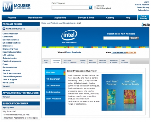 Mouser의 인텔 포트폴리오는 최신 4세대 Core™ 및 이전 세대 Core™ 와 Atom™ 프로세서부터 가장 최신의 22 nm 공정 기술이 채택된 Core™ i7, i5, i3, Pentium®, Celeron® 와 Xeon® 프로세서까지 포함하고 있다. Mouser의 인텔 제품 라인업은 또한 Express 칩셋, 이더넷 컨트롤러, 시스템 콘트롤러에서 Next Unit of Computing (NUC) 까지 다양하다.