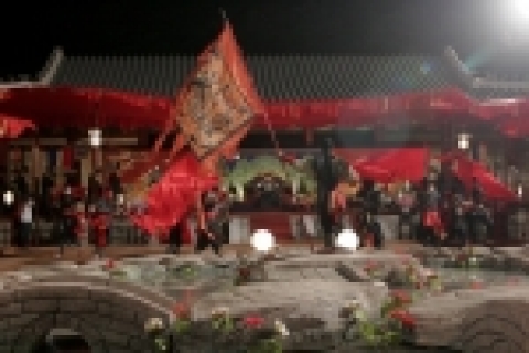 연산의 생모인 폐비 윤씨가 선왕(성종)의 후궁들의 모함으로 사약을 받았다는 사실은 궁에서 공론화될 수 없던 민감한 사건이었기 때문에 광대들은 경극 분장을 하고 청나라를 배경으로 설정한 것이다. 장생과 공길의 놀이판이 본격적으로 시작되기 전, 광대무리들이 아크로바틱한 깃발 군무를 선보이며 흥을 돋우고, 무대 뒤의 장생 일행은 극도의 긴장감에 휩싸인다.