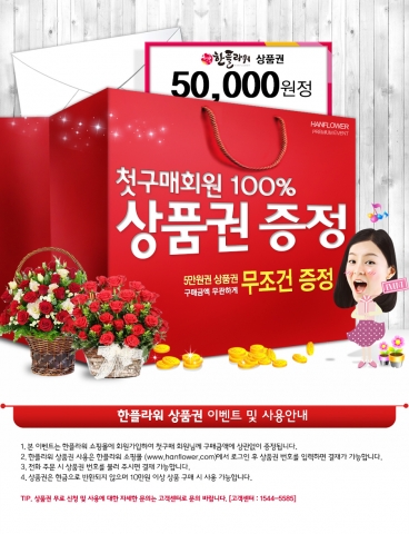 한플라워 쇼핑몰(www.hanflower.com)에서 지난해 하반기부터 진행하는 ‘행복한 첫경험, 꽃을 선물하세요!!’ 이벤트는 첫 구매 회원이 홈페이지에서 접속해 어떠한 상품을 구매하더라도 구매금액과 무관하게 5만원 상품권을 증정한다.
