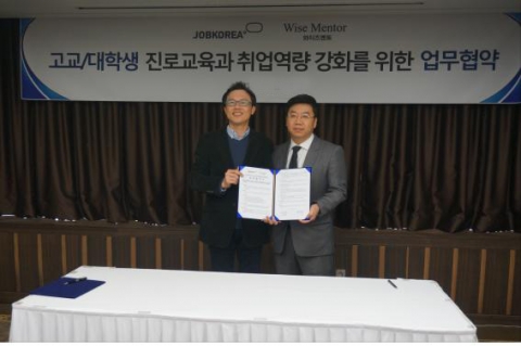 서울--(뉴스와이어)--진로적성교육 전문연구소 와이즈멘토(대표이사 조진표)는 국내 대표 취업포털사이트 잡코리아(대표이사 김화수)와 업무제휴 협약(MOU)을 체결했다고 4일 밝혔다.