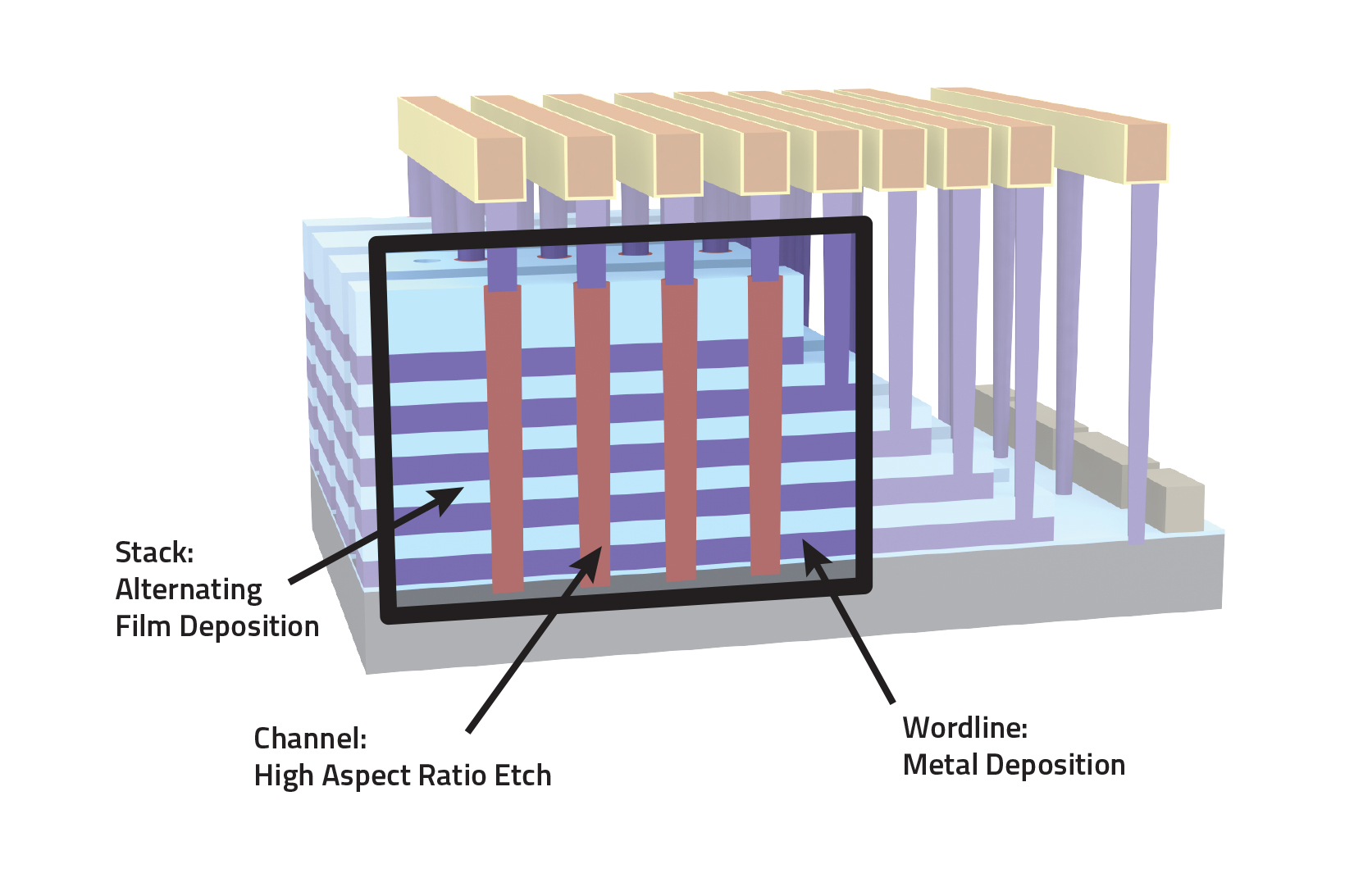 메모리 고객사들이 해당 기기들의 생산을 늘림에 따라, 제조 비용 절감을 위한 공정 제어의 증강이 요구된다. 당사의 새로운 시스템은 3D NAND 메모리셀을 구성하는 3가지 중요 단계에 적용되는데, 이는 각각 스택 증착(VECTOR® Q Strata™), 채널 식각(2300® Flex™ F Series), 텅스텐 워드라인 증착(ALTUS® Max ICEFill™)이다.