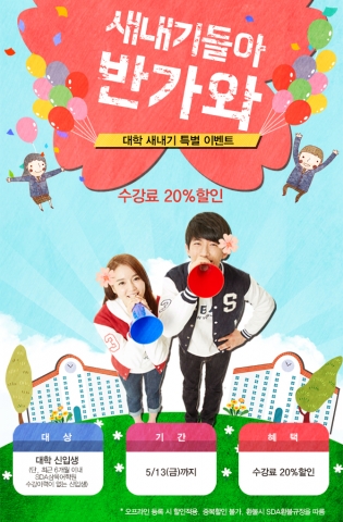 또한 대학새내기 20%할인 이벤트도 진행된다. 이 이벤트는 6개월간 SDA삼육어학원에 수강이력이 없는 대학 신입생을 대상으로 한다.
