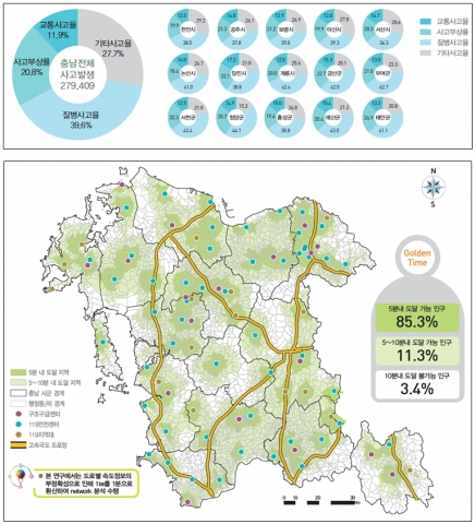 또한 “이를 행정동·리 개소 수와 사고발생 지점 수 기준으로 보면 전체 4,417개소의 행정동·리 중 5분내 도달가능한 곳은 3,777개소(85.5%), 전체 사고지점 279,409개소 중 260,719(93.3%)개소가 구급센터에서 10분내 도달 가능했던 것으로 파악됐다”고 말했다.