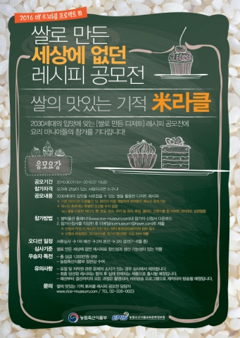 이번 공모전은 식자재로써 쌀의 가능성을 타진하고 쌀 소비를 확대하기 위해 추진된다. 케이크·빵·음료·쿠키·샐러드·간편식품 등 쌀을 재료로 한 디저트로 소비자의 입맛을 사로잡을 수 있는 레시피라면 무엇이든지 누구나 응모할 수 있다. 쌀 박물관 홈페이지에서 참가 신청서를 내려 받아 작성한 후 개발한 레시피 사진이나 제작 동영상을 첨부하여 이메일로 제출하면 된다. 6월 1일(수)부터 7월 15일(금)까지 서류 접수를 진행한다.
